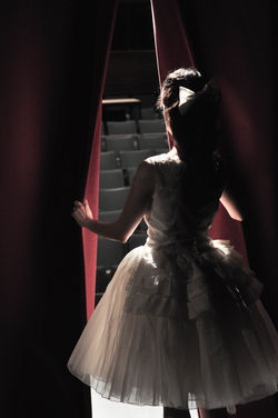 ![]() The finished dress, made to befit an 1880's ballet chorus girl. | ![]() The original wedding dress, purchased at a thrift store for $10. The sleeves were removed and made into a hair bow, while the skirt was cut in half and layered together to create more volume. | ![]() The finished dress, as modeled by Martina C. Satin slippers were bought, tea-stained ivory to match the dress, and blocked at the toes with foam. |